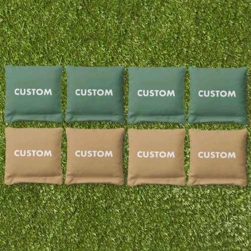 Create your own custom cornhole bags. Your photo, logo, design, and personalized text on two sets of four (8) custom cornhole bean bags, available in a choice of seventeen colors to match any wedding theme or your team colors.